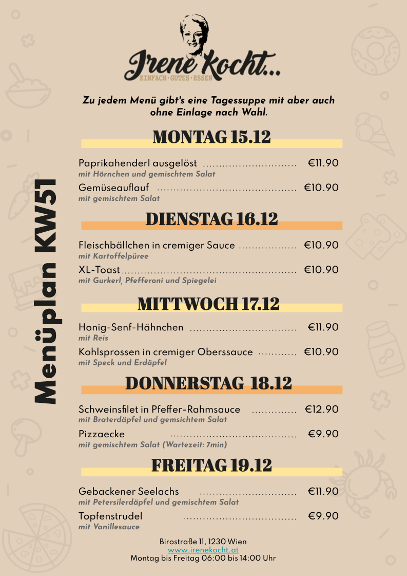 Irene kocht ist eine kleine, gemütliche Kantine in Wien, die von Irene mit viel Leidenschaft geführt wird. Unter dem Motto „einfach gutes Essen“ bietet sie ihren Gästen täglich frisch zubereitete, bodenständige Speisen. Der Fokus liegt auf hausgemachten Gerichten, ehrlicher Küche und einem freundlichen Ambiente – ideal für alle, die in der Mittagspause unkompliziert und gut essen möchten.